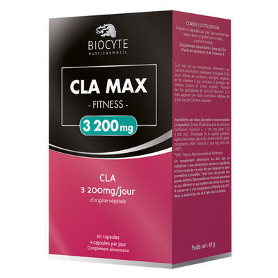 CLA max de BIOCYTE, le complément alimentaire sous forme de capsules qui contient des Acides Linoléiques Conjugués (CLA), issus d'huile de carthame d'origine végétale, dans votre parapharmacie en ligne à prix discount.