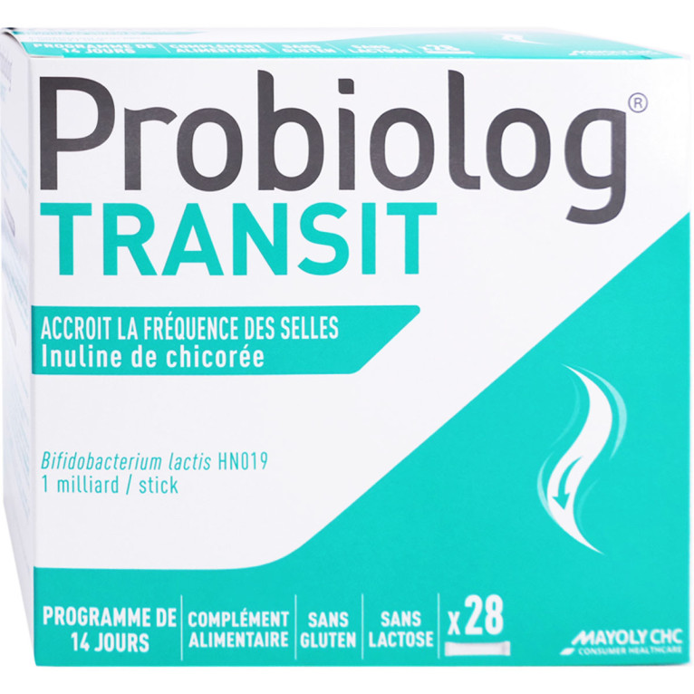 PROBIOLOG Transit est un complément alimentaire en sachet composé d’inuline de Chicorée ainsi qu'une souche microbiotique Bifidobacterium lactis HN019 dosée à 1 milliard par stick.