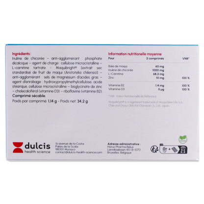 Pour 2 comprimés : Bai de maqui 60 mg ; Inuline de chicorée 1000 mg ; L-Carnitine 68,2 mg ; Zinc 10 mg (100 % VNR*) ; Vitamine B2 1,4 mg (100% VNR*) ; Vitamine B2 5 μg (100% VNR*).