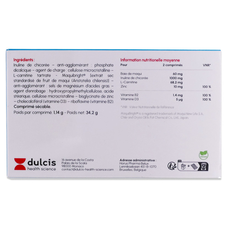 Ce complément alimentaire est formulé par le laboratoire Dulcis Health Science, reconnu pour son expertise en phytothérapie et micronutrition. Il associe des ingrédients soigneusement sélectionnés tels que la Baie De Maqui Maquibright®, l'Inuline De Chicorée, la Vitamine D, et surtout la Riboflavine (Vit B2) et le Zinc. La riboflavine contribue au maintien des muqueuses et d'une vision normales et contribue à la protection des cellules contre le stress oxydatif. Le zinc, quant à lui, participe également à la protection des cellules contre le stress oxydatif et au soutien de la vision normale. Ces ingrédients agissent en synergie pour offrir un soutien optimal.