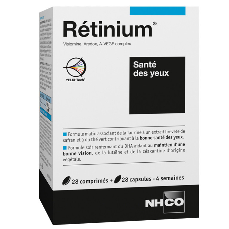 RETINIUM Santé des yeux de NHCO est un complément alimentaire composé de plusieurs actifs qui contribuent à la bonne santé des yeux. Une formule innovante Matin & Soir qui associe des acides gras essentiels, des acides aminés, du Fer à des végétaux. La formule du matin est composée de 3 complexes. Le complexe Visiomine est composé de Taurine, acide aminé présent dans la rétine, et est associé aux vitamines D3 et B2 qui contribue au maintien d'une vision normale. Le complexe Aredox est composé de Bêta-Alanine, de vitamine C et de cuivre qui contribuent à la protection des cellules contre le stress oxydatif, ainsi que d'extrait de safran et de concentré de jus de melon. Le complexe A-VEGF est composé d'extrait de thé vert qui contribue au maintien d'une bonne santé des yeux, et de N-Acétyl-Cystéine, acide aminé.