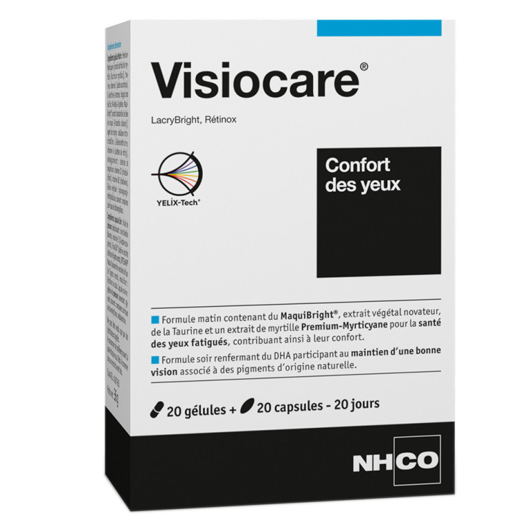 VISIOCARE Confort des yeux Laboratoire NHCO NUTRITION, à prix discount, un complément alimentaire à base d’acides aminés, de minéraux, de vitamines, et de plantes dont la myrtille qui aide à maintenir la santé des yeux grâce dans votre parapharmacie en ligne. Gélules Matin et Capsules Soir.