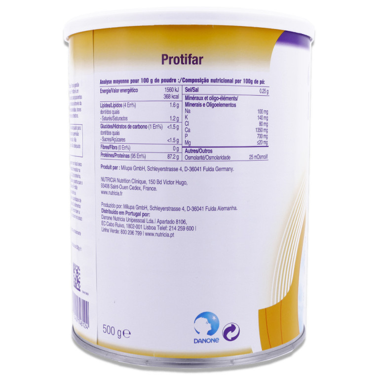 Information nutritionnelle par 100g de poudre Nutricia Protifar- Valeurs énergétiques: 380 kcal/1615 kJ- Protéines 89g- Glucides dont <1.5g - Sucres <1.5g - Lactose <1.5g- Lipides dont 2g - saturés 1.5g - monoinsaturés 0.5g - polyinsaturés 0.1gMinéraux par 100 g de poudre Nutricia Protifar- Sodium 100mg- Potassium 120mg- Calcium 1350mg- Phosphore 700mg- Magnésium <20mg- Chlorure 100mg