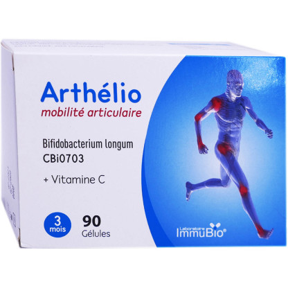 Arthélio mobilité articulaire des laboratoires IMMUBIO est un complément alimentaire qui propose une association originale d'une culture totale lyophilisée de Bifidobacterium longum CBi703 inactivée, et de la vitamine C qui contribue à la formation normale de collagène pour assurer la fonction normale des cartilages. Sans colorant et sans conservateur.
