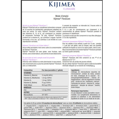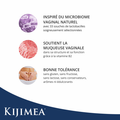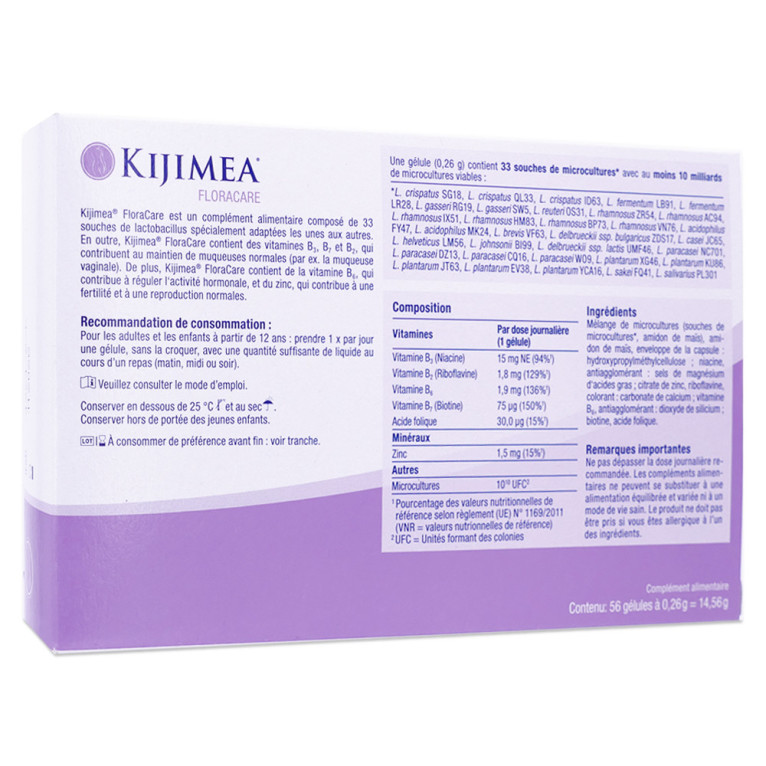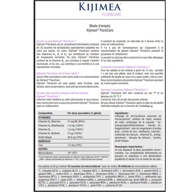 Kijimea® FloraCare est un complément alimentaire intégrant 33 souches de lactobacillus harmonieusement combinées. Il inclut également les vitamines B3, B7 et B2, qui contribuent à préserver des muqueuses saines. En sus, Kijimea® FloraCare offre de la vitamine B6, soutenant la régulation de l'activité hormonale, ainsi que du zinc, essentiel pour une fertilité et une reproduction optimales.
