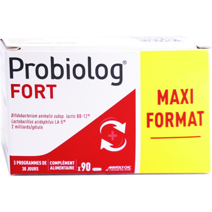 PROBIOLOG Fort des laboratoires Mayoly Spindler est un complément alimentaire sous forme de gélules, composé de 2 souches microbiotiques naturellement présent dans l'organisme, dosées à 2 milliards par gélules (Lactobacillus acidophilus LA-5 et Bifidobacterium Lactis BB-12).