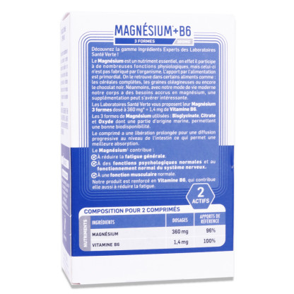 Le laboratoire Santé Verte propose une gamme de compléments alimentaires innovants, formulés pour répondre aux besoins spécifiques de l'organisme. Ce produit contient trois formes de magnésium : bisglycinate, citrate et oxyde, dosées à 360 mg pour une libération prolongée. Le magnésium est reconnu pour contribuer à la réduction de la fatigue, aux fonctions psychologies normales, à une fonction musculaire normale et au bon fonctionnement du système nerveux. La vitamine B6 va également contribuer à réduire la fatigue.