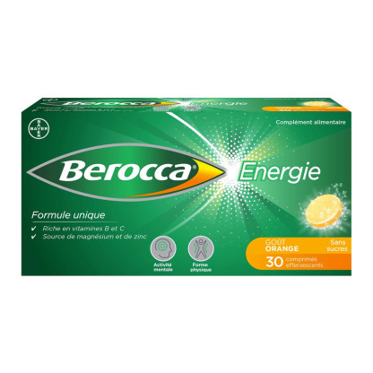 Berocca Energie des laboratoires BAYER est un complément alimentaire sous forme de comprimés effervescents, riche en vitamines et minéraux (vitamines B et C, magnésium, calcium, zinc). Les vitamines B9 et C contribuent à réduire la fatigue et le zinc contribue au fonctionnement cognitif normal. Son goût à l’Orange sans sucre plaira à tout le monde et Berocca Energie pourra être pris en cas de fatigue passagère, activités physiques, ou d'activité de concentration.