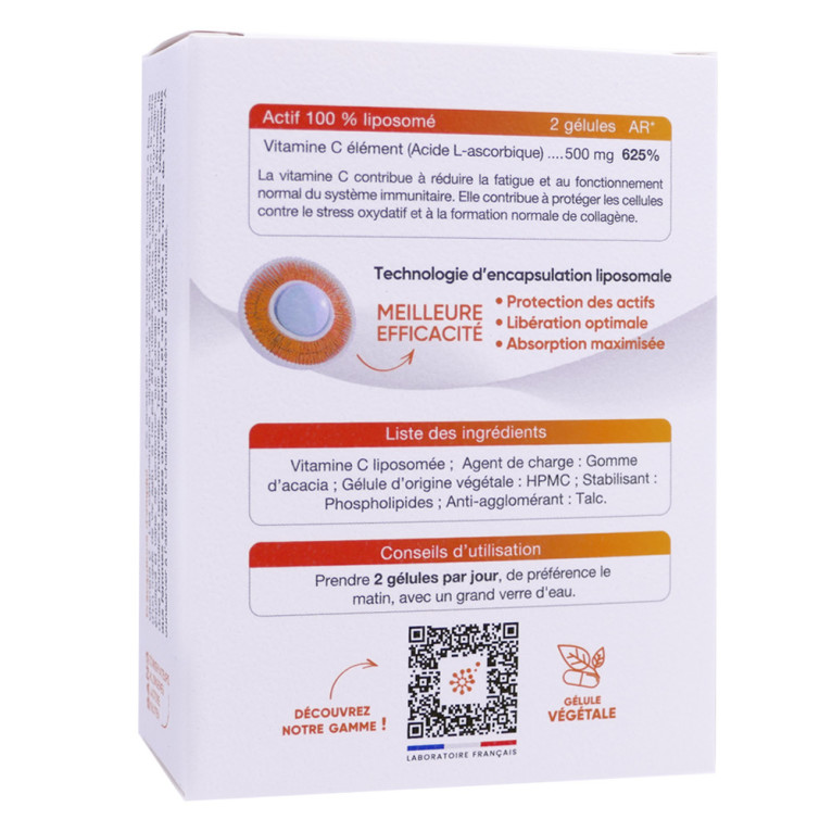 Vitamine C liposomée ; Agent de charge : Gomme d'acacia ; Gélule d'origine végétale : HPMC ; Stabilisant: Phospholipides ; Anti-agglomérant : Talc.Pour 2 gélules : Vitamine C liposomée (Acide L-ascorbique) 500 mg 625% AR*. *Apports de référence