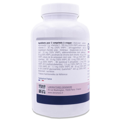 Composition nutritionnelle et valeurs nutritionnelles de référence (VNR) pour 2 comprimés à croquer :Myo-Inositol : 2000 mgZinc : 10 mg - 100% VNRIode : 150 μg - 100% VNRSélénium : 50 μg - 90% VNRChrome 40 µg - 100%Vitamine C : 180 mg - 225% VNRVitamine E : 30 mg - 250% VNRVitamine B3 : 16 mg - 100% VNRVitamine B5 : 6 mg - 100% VNRVitamine B6 (Pyridoxal-5-phosphate monohydrate) : 2 mg - 143% VNRVitamine B2 : 1,4 mg - 100% VNRVitamine B1 : 1,1 mg - 100% VNRVitamine B9 (5-MTHF) : 600 μg - 300% VNRVitamine B8 : 50 μg - 100% VNRVitamine D3: 15µg - 300% VNRVitamine B12 (méthylcobalamine) : 2,5 μg - 100% VNR