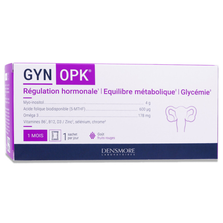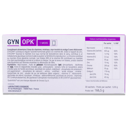 Le laboratoire Densmore propose une gamme de compléments alimentaires formulés pour répondre aux besoins spécifiques des femmes. Ce produit contient des vitamines, minéraux, myo-inositol et oméga 3. La vitamine B6 contribue à la régulation de l'activité hormonale. Le zinc soutient la fertilité et la reproduction normales, et également participe à un métabolisme énergétique normal. Le chrome participe au maintien d'une glycémie normale. Les folates (vitamine B9) et la vitamine B6 sont essentiels pour le maintien d'un état psychologique normal et pour réduire la fatigue. L'oméga 3, quant à lui, complète la formule. Grâce à cette synergie d'ingrédients, le complément alimentaire GYN OPK offre un soutien optimal pour le confort féminin.
