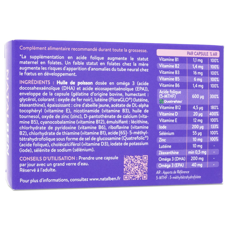 Il contient de l'acide folique sous forme de 5‑méthyltétrahydrofolate (Quatrefolic®), qui contribue à la croissance des tissus maternels pendant la grossesse. Les oméga-3, notamment le DHA,associés à la lutéine et la zéaxanthine participent au maintien d'une fonction cérébrale et visuelle normale. Les vitamines B12 et D soutiennent le fonctionnement normal du système immunitaire et la formation normale des globules rouges. La vitamine B12 va également contribuer à un métabolisme énergétique normal et au fonctionnement normal du système nerveux, tandis que la vitamine D contribuera également à l'absorption et l'utilisation normales du calcium. L'iode contribue à la production normale d'hormones thyroïdiennes. Ce produit ne contient pas de nanoparticules.