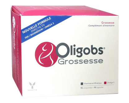 OLIGOBS GROSSESSE est un complément alimentaire sous forme de capsules et de comprimés, composé de vitamines (B9), de minéraux (magnésium, zinc, fer, cuivre, sélénium) et d'oméga 3 (DHA). Parmi les vitamines on trouve des vitamines B9 ou folates qui contribuent à la croissance des tissus maternels pendant la grossesse. De plus le fer contenu dans cette formule participe à réduire la fatigue.