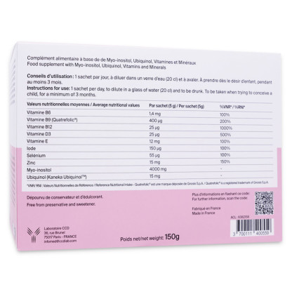 Ce produit contient du myo-inositol un composé naturellement présent dans certaines cellules, et de l'ubiquinol. Le zinc contribue à une fertilité et une reproduction normales, associé au sélénium ils contribuent à la protection des cellules contre le stress oxydatif. Les vitamines, dont la B9 sous forme de Quatrefolic®, soutiennent la croissance des tissus maternels. L'iode, quant à lui, complète la formule.