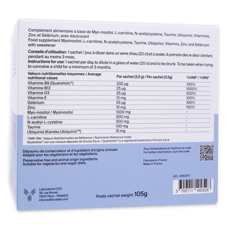 Complément alimentaire à base demyo-inositol, de L-carnitine, de N-acétylcystéine, de taurine, d’ubiquinol, de vitamines, de zinc, de sélénium. Avec édulcorant. Sans ingrédient d'origine animale, sans conservateur. Adapté pour les végétariens et les végétaliens