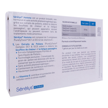 Il contient des extraits de pollen (PureCyTonin® Complex DC1 & DC3) et de la vitamine E. Les extraits de pollen participent à diminuer les bouffées de chaleur pendant cette période et aide en cas de fatigue, tandis que la vitamine E contribue à la protection des cellules contre le stress oxydatif. Les extraits de pollen possèdent une grande biodisponibilité et regorgent de nutriments. Pour obtenir le cytoplasme du pollen, l'enveloppe du grain de pollen est retirée. SERELYS HOMME BOUFFÉES DE CHALEUR est non hormonal et sans activité phyto-estrogénique.