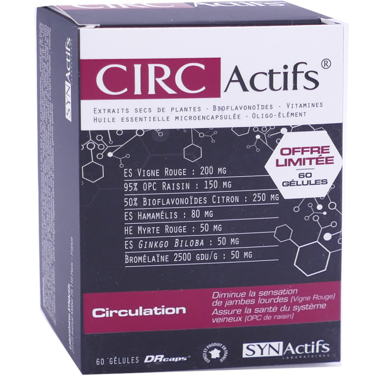 Les laboratoires SYNACTIFS élaborent des compléments alimentaires à base d'actifs naturels. CIRCACTIF se décompose en 3 phases. La Bromélaïne va avoir une action immédiate tandis que la vigne Rouge, l’huile essentielle de myrte rouge et l’hamamélis vont contribuer à une action prolongée et agiront sur la diminution de sensation de jambes lourde. CIRCACTIF va avoir une action à 360° sur l'ensemble de la circulation sanguine (action de fond) grâce à tous ces Actifs combinés en extraits secs de plantes (vigne rouge, OPC de raisin, hamamélis, Ginkgo Biloba), en huile essentielle de myrte rouge micro-encapsulée, en sélénium ainsi qu’en Vitamine B6 et E.