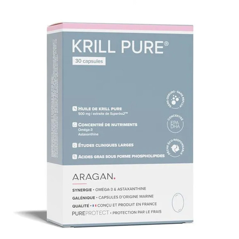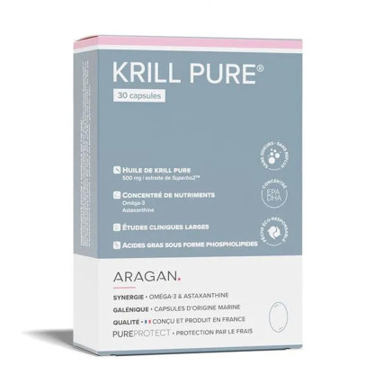 La gamme Krill des laboratoires ARAGAN est composée de compléments alimentaires à base d'oméga 3 nécessaires au bien-être de l'organisme au quotidien. KRILL PURE est un complément alimentaire à base uniquement d’huile de krill qui est extraite d’une petite crevette vivant dans les eaux froides, très riche en acides gras et en oméga 3 sous forme de phospholipiedes oméga-3, en acide eicosapentanoïque (EPA) et en acide docosahexaénoïque (DHA). Ce complément alimentaire aux propriétés antioxydantes va participer au bon fonctionnement du cœur, du cerveau et de la vision chez toute la famille.