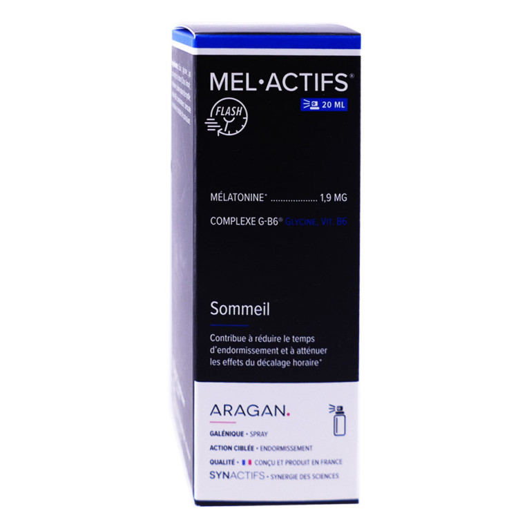 Développé par le laboratoire Aragan, ce produit est spécialement conçu pour favoriser l'endormissement et améliorer la qualité du sommeil. Sa formule unique contient de la mélatonine, qui contribue à atténuer les sensations de décalage horaire* et à réduire le temps nécessaire à l'endormissement**.. Grâce à la mélatonine, Aragan Mel Actifs Flash Sommeil vous permettra de vous détendre et de vous endormir plus facilement, pour des nuits paisibles et reposantes. N'hésitez plus et offrez-vous des nuits de sommeil réparateur avec Aragan Mel Actifs Flash Sommeil 20ml.