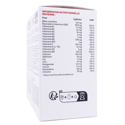 Carbonate de calcium ; carbonate de magnésium ; maltodextrine ; vitamine C (éthylcellulose) ; cellulose ; phosphate de potassium ; bêtacarotène (amidon modifié) ; vitamine E (lactose, caséinate de sodium) ; fumarate de fer ; molybdate de sodium (maltodextrine) ; oxyde de zinc ; vitamine B3 ; sulfate de manganèse ; vitamine B5 ; antiagglomérant : stéarate de magnésium ; stabilisant : mono et diglycérides d'acide gras ; vitamine B1 (mono et diglycérides d'acides gras) ; sélénite de sodium (maltodextrine) ; carbonate de cuivre ; vitamine B6 ; chlorure de chrome (cellulose) ; vitamine D3 (triglycérides à chaînes moyennes, amidon modifié, sucrose) ; vitamine B2 ; huile de tournesol, vitamine B12 (maltodextrine) ; vitamine B9 ; vitamine B8 ; antioxygène : extrait riche en tocophérols. Enveloppe : gélatine ; colorant d'origine végétale : complexes cuivriques de chlorophyllines ; sans dioxyde de titane.