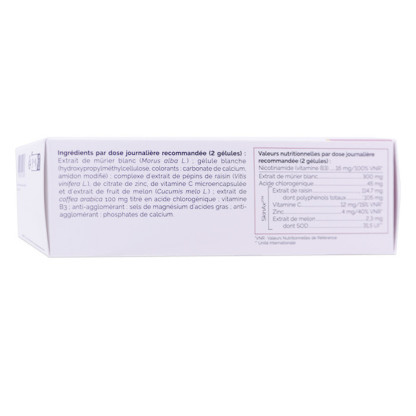 Valeurs nutritionnelles par dose journalière recommandée (2 comprimés) : Extrait de mûrier blanc: 260 mg Extrait de tomate blanche: 170 mg Extrait de raisin 112,5 mg dont polyphénols totaux 105 mg Vitamine C 12 mg / 15% VNR* Zinc 1,5 mg / 15% VNR* Extrait de melon 337 µg dont SOD 31,5 UI** Niacine 16 mg / 100% VNR*. *VNR : Valeurs Nutritionnelles de Référence