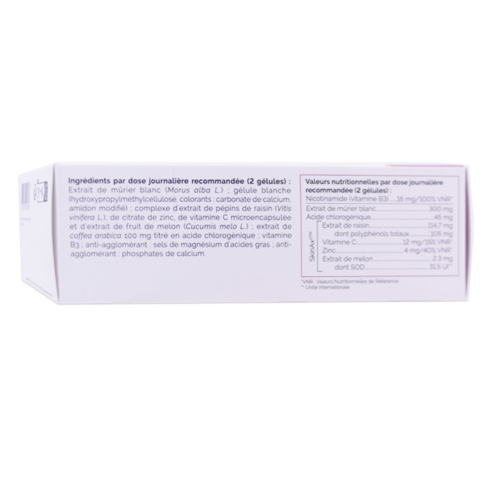Extrait de fruit de mûrier blanc (Morus alba L.) ; Maltodextrine ; Extrait de fruit de tomate blanche (Lycopersicon esculentum Mill.) ; Enveloppe de la gélule (Gélatine ; Colorant : Oxydes de fer) ; SkinAx²™ [Extrait de pépins de raisin (Vitis vinifera L.) dont Polyphénols ; Citrate de zinc ; Acide-L-ascorbique dont Vitamine C (Agent d'enrobage : Éthylcellulose) ; Extrait de fruit de melon (Cucumis melo L.) dont SuperOxyde Dismutase (SOD) (Huile de palme partiellement hydrogénée)] ; Nicotinamide (Vitamine B3) ; Émulsifiant : Sels de magnésium d'acides gras ; Anti-agglomérant : Dioxyde de silicium [Nano].
