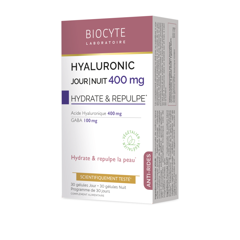 HYALURONIC Jour/Nuit 400mg Anti-âge 24H discount des laboratoires BIOCYTE, un complément alimentaire en gélules jour et nuit composé d'acide Hyaluronique destiné aux personnes souhaitant repulper leur peau, dans votre parapharmacie en ligne à prix discount.