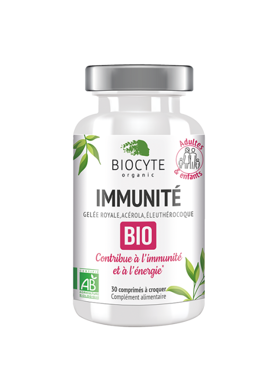 Développée par le Laboratoire BIOCYTE la gamme BIOCYTE Organic est composée de compléments alimentaires respectueux de la santé dont les matières premières sont issues de l’agriculture biologique. IMMUNITÉ BIO Biocyte Organic est un complément alimentaire avec sucre à base d’extraits de plantes BIO et de gelée royale BIO qui convient aux petits (à partir de 6 ans) et grands.La vitamine D issue de l’extrait de lichen BIO contribue au fonctionnement normal du système immunitaire. La vitamine C issus de l’extrait d’acérola BIO contribue à diminuer la fatigue et contribue également à un métabolisme énergétique normal.