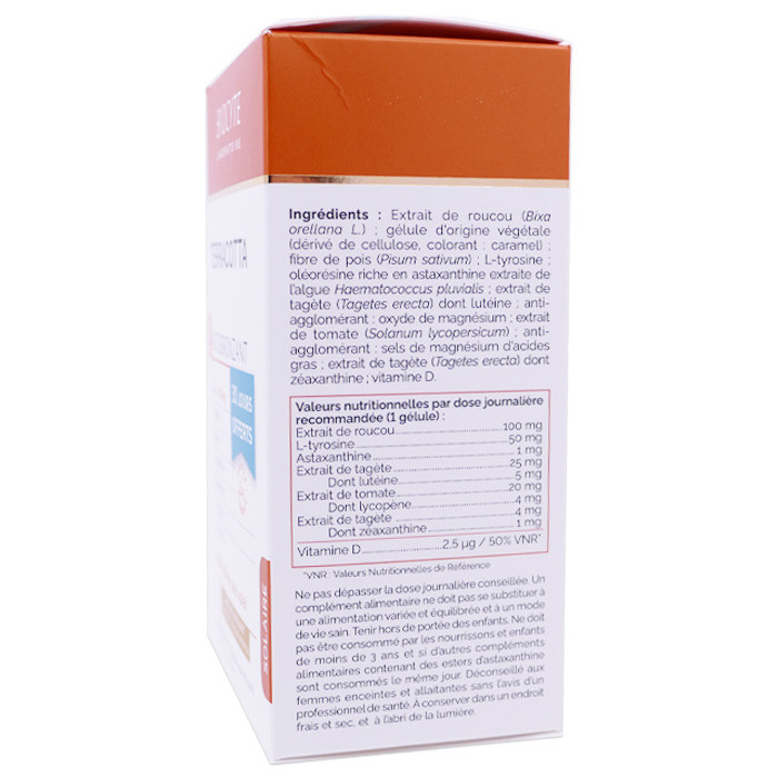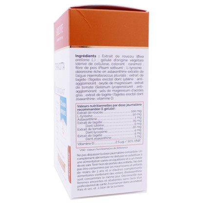 Complément Alimentaire à base de: Extrait de roucou (Bixa orellana L.) ; gélule d'origine végétale (dérivé de cellulose, colorant : caramel) ; fibre de pois (Pisum sativum) ; L-tyrosine ; oléorésine riche en astaxanthine extraite de l’algue Haematococcus pluvialis ; extrait de tagète (Tagetes erecta) dont lutéine ; anti-agglomérant : oxyde de magnésium ; extrait de tomate (Solanum lycopersicum) ; anti-agglomérant : sels de magnésium d'acides gras ; extrait de tagète (Tagetes erecta) dont zéaxanthine ; vitamine D.