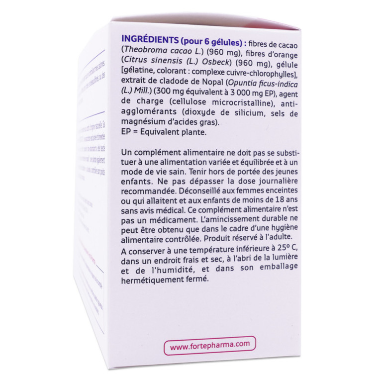 Fibres De Cacao (Theobroma Cacao L.) (960 Mg), Fibres D’Orange (Citrus Sinensis (L.) Osbeck) (960 Mg), Gélule [Gélatine, Colorant : Complexe Cuivre-Chlorophylles], Extrait De Cladode De Nopal (Opuntia F Icus-Indica (L.) Mill.) (300 Mg Équivalent À 3 000 Mg Ep), Agent De Charge (Cellulose Microcristalline), Antiagglomérants (Dioxyde De Silicium, Sels De Magnésium D’Acides Gras). Ep = Equivalent Plante.