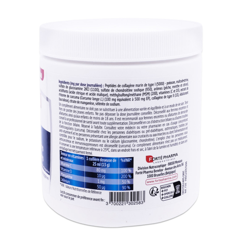 Ingrédients (mg par dose journalière) : Peptides de collagène marin de type I (5000) - poisson, maltodextrine, sulfate de glucosamine 2KCl (1100), sulfate de chondroïtine sodique (950), arômes (pêche, menthe et citron), acidifiants (acide citrique et acide malique), méthylsulfonylméthane (MSM) (200), vitamines (C et D3), extrait extrait de rhizome de curcuma (Curcuma longa L.) (100 mg équivalent à 500 mg EP), collagène de type II (10), édulcorant (sucralose), citrate de manganèse, sélénite de sodium.