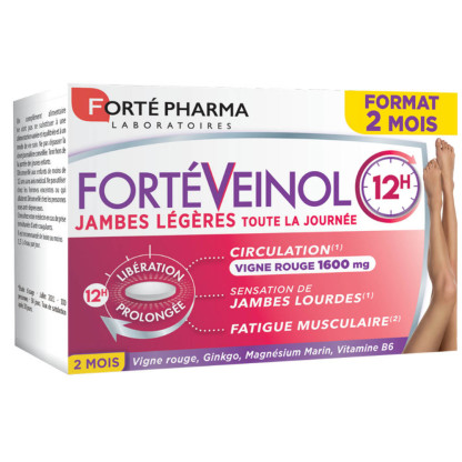FortéVeinol est un complément alimentaire sous forme de comprimés à libération prolongée composé de 5 extraits de plantes (Marronnier d’Inde, Mélilot, Gingko biloba, Vigne Rouge, de vitamines (C et E) et de magnésium d’origine marine. La vigne rouge soutient la circulation veineuse et maintient l’intégrité de la bonne santé des vaisseaux et capillaires sanguins. Le magnésium contribue à réduire la fatigue et à une fonction musculaire normale. La vitamine B6 contribue à réduire la fatigue. Rapidement les jambes sont plus légères et moins douloureuses, pour longtemps grâce à sa diffusion continu pendant 12 heures.