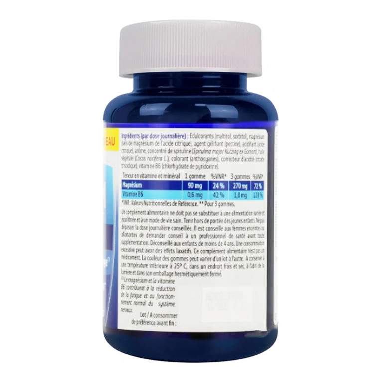 Ingrédients (par dose journalière) : Édulcorants (maltitol, sorbitol), magnésium (sels de magnésium de l'acide citrique), agent gélifiant (pectine), acidifiant (acide citrique), arôme, concentré de spiruline (Spirulina major Kützing ex Gomont), huile végétale (Cocos nucifera L.), colorant (anthocyanes), correcteur d'acidité (citrate trisodique), vitamine B6 (chlorhydrate de pyridoxine)