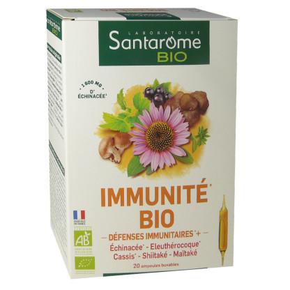Immunité Bio conditionnés en ampoules, est un complément alimentaire composé de 3 plantes bio: éleuthérocoque, cassis, échinacée et de 2 champignons : shiitaké (champignon parfumé d’origine asiatique), maitaké (levure). L'échinacée aide à soutenir les défenses de l'organisme et le système immunitaire.