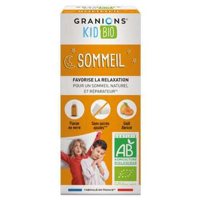 Le produit GRANIONS KID BIO SOMMEIL 125ML est composé d'extraits de plantes bio (fleur d'oranger, , passiflore, eschscholtzia, tilleul, camomille, verveine). L'eschscholtzia contribue à participer à la relaxation pour un sommeil réparateur et naturel. Ce produit est idéal pour les enfants qui ont des difficultés à s'endormir ou qui se réveillent souvent la nuit. Il est facile à prendre grâce à son goût agréable d'abricot et ne contient ni colorant ni conservateur.