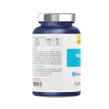 Ingrédients : Magnésium marin (oxyde de magnésium), agents de charge : cellulose microcristalline - phosphate tricalcique, antiagglomérant : stéarate de magnésium, vitamine B6.