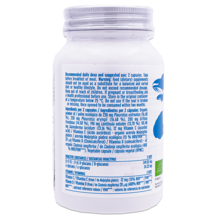 60 gélules (689,5mg). Chaque gélule contient 115 mg de poudre de Pleurotus ostreatus bio, 115 mg de poudre de Pleurotus eryngii bio, 100 mg de poudre de Grifola frondosa bio, 95 mg de poudre de Lentinula edodes bio, 90. 74 mg de poudre de Ganoderma lucidum bio, 6 mg de vitamine C (acide ascorbique) – acérola Malpighia glabra bio, 10 μg de vitamine D (cholécalciférol) – Cladonia rangiferina bio.