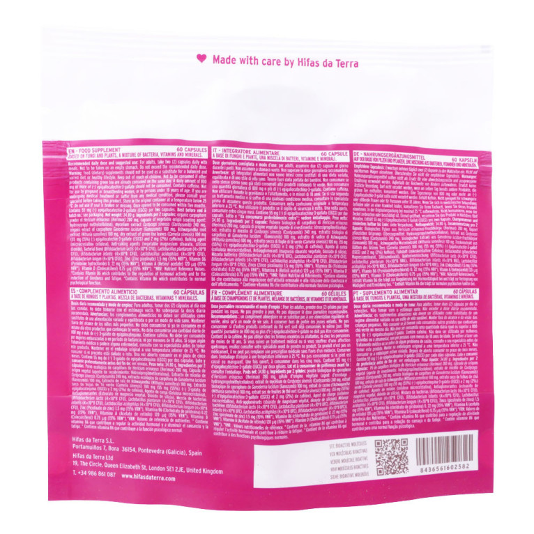 Ingrédients par 2 capsules: Poussière de carpophore écologique de Hericium erinaceus Dans Cordyceps Sinensis (Cordyzumib ®) 240 mg, extrait écologique de Ganoderma lucidum (Ganozumib®) 100 mg, extrait de racine Ashwagandha (somnifera) 100 mg, feuilles de thé vert sèche (Camelia sinensis) 100 mg (55 mg (-) 3-épigalococatequina (EGCG) et 2 mg de caféine), agent de cargaison (cellulose microcristalline), anti-corporel (stéarate de magnésium végétal, dioxyde de silicium), mélange de bactéries (stéarate de magnésium végétal, dioxyde de silicium), mélange de bactéries (Bifidobacterium lactis (4×108 CFU), Lactobacillus plantarum (4×108 CFU), Bifidobacterium infantis (4×108 CFU), Lactobacillus acidophilus (4×108 CFU), Bifidobacterium longum (4×108 CFU), zinc (picoline zinc) 1,5 mg (15% VRN *), vitamine B6 (chlorhydrate de pyridoxine) 0,22 mg (15% VRN *), vitamine A (rétinyle) 120 μg (15% VRN *), vitamine D (cholécciferol) 0,75 μg (15% VRN *). * VRN: valeurs de référence des nutriments