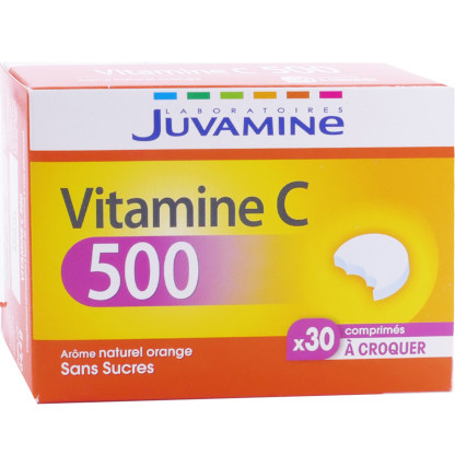 JUVAMINE Vitamine C 500 30 comprimés à croquer du laboratoire JUVAMINE à prix discount, en vente dans votre parapharmacie en ligne discount, un complément alimentaire à base de vitamine C qui contribue à réduire la fatigue.