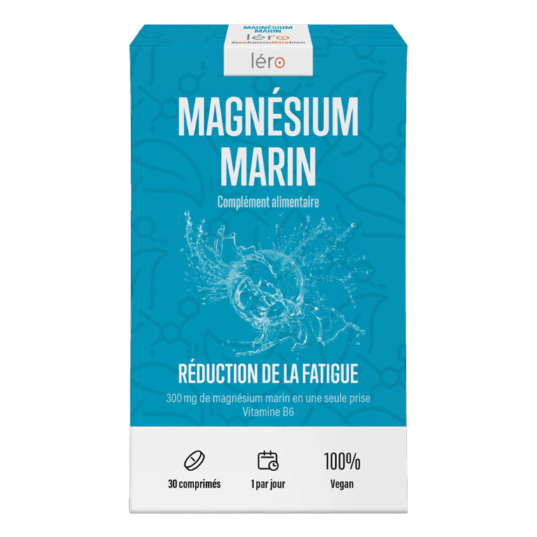 Magnésium Marin de LERO est un complément alimentaire, composé de magnésium extrait d'eau de mer et de vitamine B6. Le magnésium et la vitamines B6 permettent de contribuer au fonctionnement normal du système nerveux mais également à réduire la fatigue. Un comprimé quotidien apporte 300mg de magnésium.