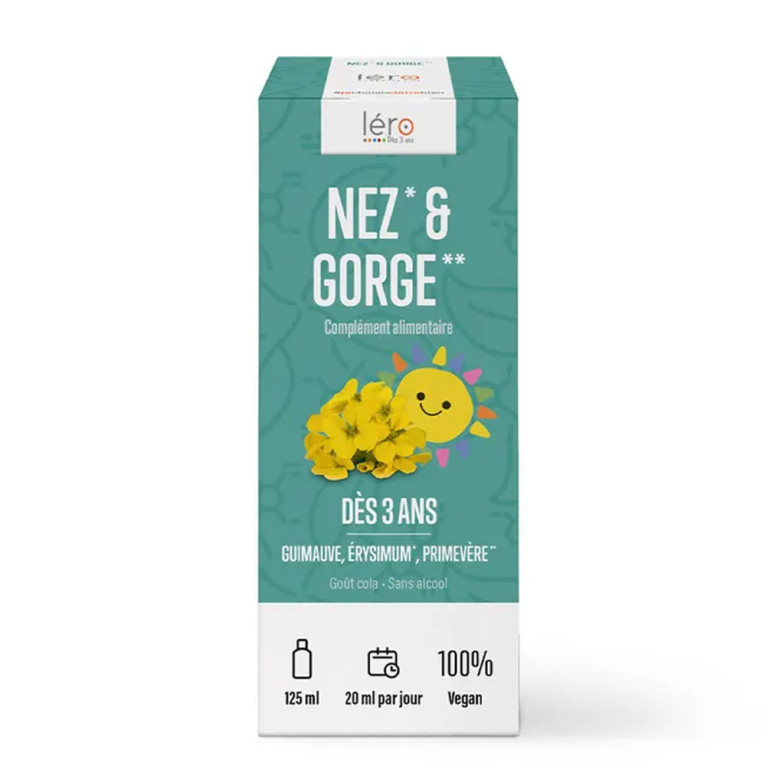 Le sirop Nez & Gorge est un complément alimentaire au goût naturel cola, il est composé d’extraits de plantes (Primevère, Erisymum, Guimauve). Dans cette formule, la guimauve participe à apaiser la bouche et la gorge, et la primevère contribue à la santé des voies respiratoires supérieures et permet de soulager en cas d'irritation dans la gorge et le pharynx.
