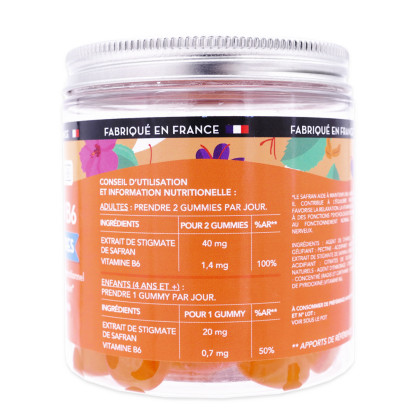 Le complément alimentaire Safran B6 sans sucres sous forme de gummies est spécialement conçu pour apporter un soutien émotionnel lors de stress, baisse de moral, anxiété, troubles de l'humeur. Enrichies en safran, un ingrédient aux propriétés reconnues pour ses effets positifs sur l'humeur, et en vitamine B6, qui contribue à réduire la fatigue et à soutenir le fonctionnement normal du système nerveux, ces gummies sont un véritable allié au quotidien. Leur goût agréable et leur texture moelleuse en font un complément facile à intégrer dans votre routine.
