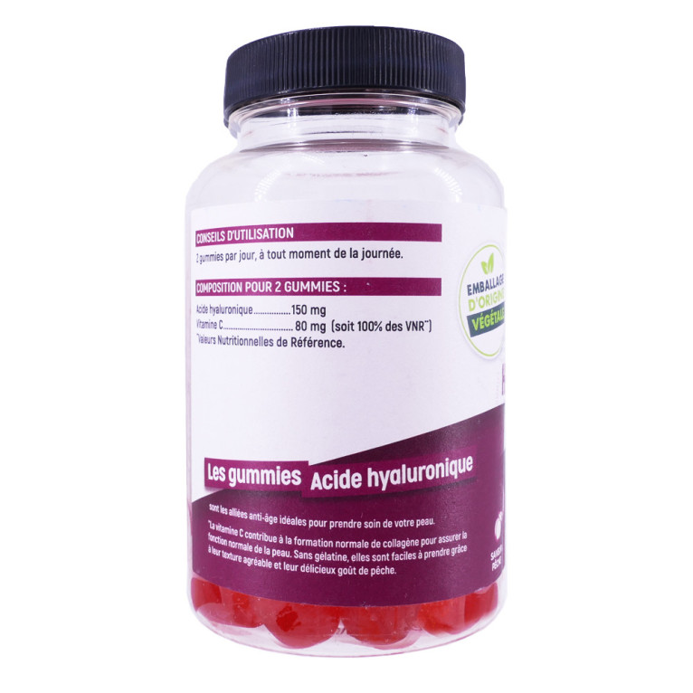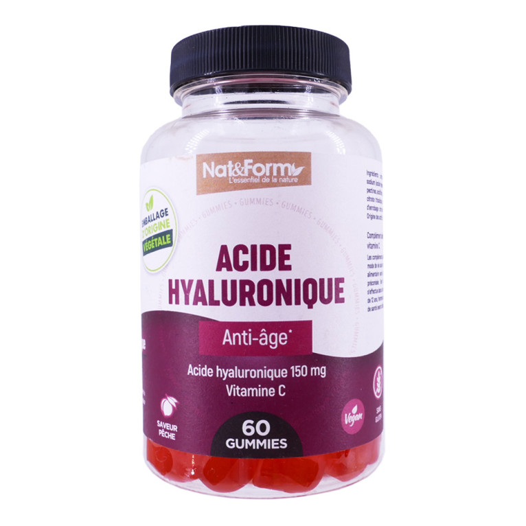 Les laboratoires Nat&Form ont développé des gummies à l'acide hyaluronique et à la vitamine C. L'acide hyaluronique est naturellement produite par le corps. Après 25 ans, sa production baisse, ce qui entraîne l'apparition de ridules et une sécheresse de la peau. L'acide hyaluronique, présent dans l'organisme, maintient l'hydratation naturelle de la peau et encourage son élasticité. Ces gummies anti-âge au délicieux goût de pêche ne contiennent aucun colorant, ni arôme artificiel, ne contiennent pas de gluten et ne sont pas testées sur les animaux. Ces délicieuses gommes sont faciles à intégrer dans votre routine quotidienne.
