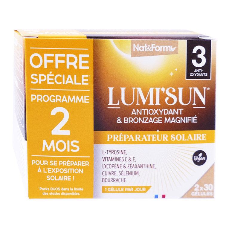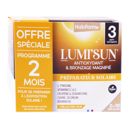 Découvrez les propriétés du LUMI'SUN ANTIOXYDANT ET BRONZAGE 2X30 GELULES, un produit de qualité proposé par Nat&Form. Ce laboratoire renommé s'engage à offrir des solutions naturelles pour prendre soin de votre santé et de votre bien-être.