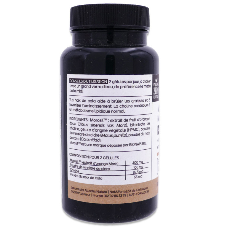 Le Morosil, extrait de l'orange sanguine, contient des polyphénols. La noix de cola, riche en caféine, contribue à brûler les graisses et au contrôle du poids corporel. La choline soutient le métabolisme lipidique normal. Le vinaigre de cidre complète la formule.
