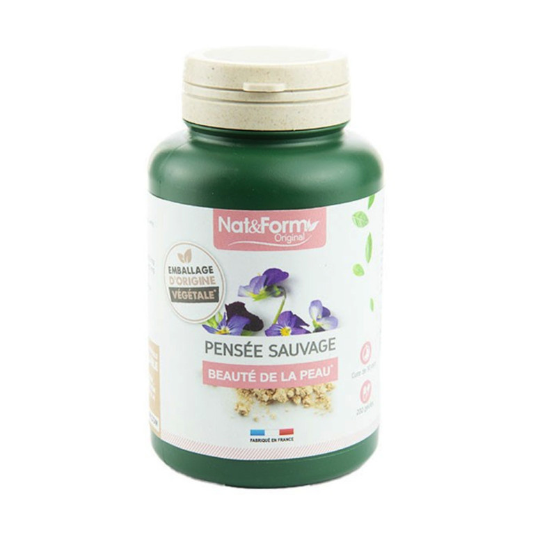 Les gélules de Pensée Sauvage Beauté de la Peau sont formulées avec de la poudre de parties aériennes de pensée sauvage. La pensée sauvage, également appelée pensée tricolore, est une espèce de plantes à fleurs de la famille des violacées. On trouve cette plante herbacée dans toute l'Europe. Cette plante aide à améliorer la santé globale de la peau, aide en cas de peau sèche et favorise la disparition des boutons. N'attendez plus et offrez-vous ce complément alimentaire à prix discount !
