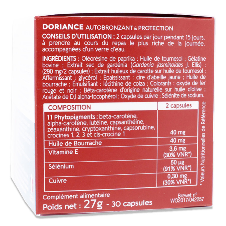 DORIANCE Capital Soleil - Dosage pour 2 capsules : Huile de Cameline : 321 mg Extrait sec de Melon (S.O.D.) : 154 µg Vitamine C : 120 mg (150% VNR*) Vitamine E : 10 mg (83% VNR*) Béta-carotène (équivalent rétinol) : 800 µg (100% VNR*) Zinc : 15 mg (150% VNR*) Sélénium : 50 µg (91% VNR*) Cuivre : 0,30 mg (30% VNR*)