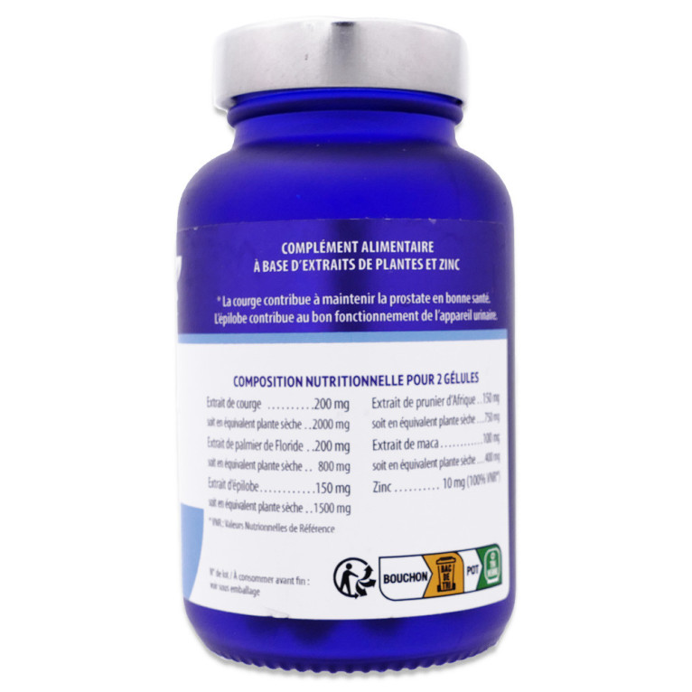 Complément alimentaire à base de plantes et zinc. Par dosage journalier : Extrait de graine de courge (Cucurbita pepo) 200mg soit 2g*, Extrait de fruit de palmier de Floride (Serenoa repens) 200mg soit 0,8g*, Extrait de partie aérienne d’épilobe (Epilobium parviflorum), 150mg soit 1,5g*, Extrait d’écorce de prunier d’Afrique (Pygeum africanum) 150mg soit 0,75g*, Extrait de racine de maca (Lepidium meyenii) 100mg soit 0,4g*, Bisglycinate de zinc 10mg/100%**. Bisglycinate de fer 12,6mg/90%**, Vitamine B5 (D-pantothénate de calcium) 2,28mg/38%**. Tunique : gélatine marine.