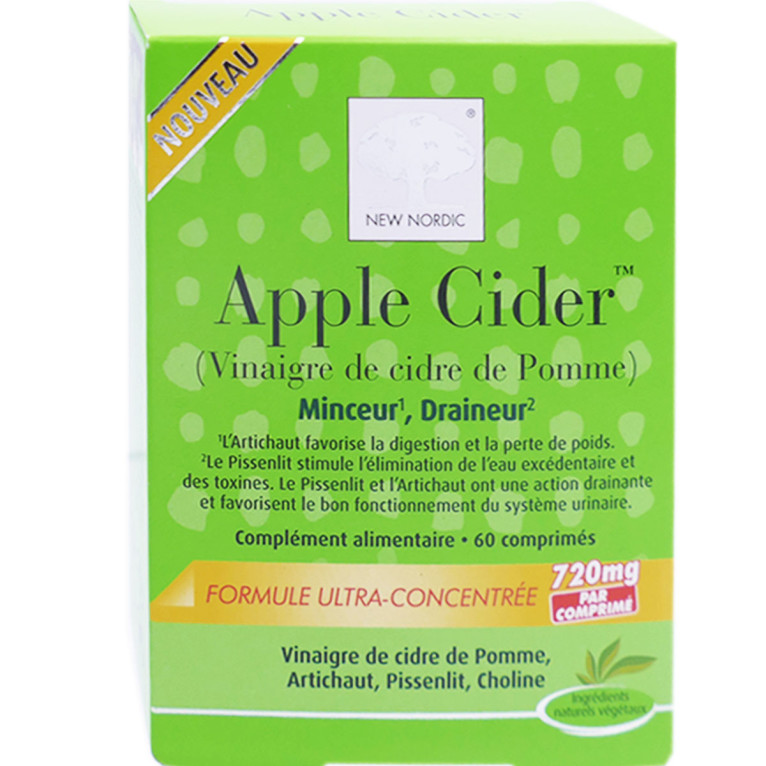 Apple Cider Minceur Draineur du laboratoire NEW NORDIC, est un complément alimentaire à base de poudre de vinaigre de pomme, utilisé par les Vikings en Scandinavie, et d'artichaut qui aide à la digestion. Le pissenlit vient s'ajouter à ce produit.