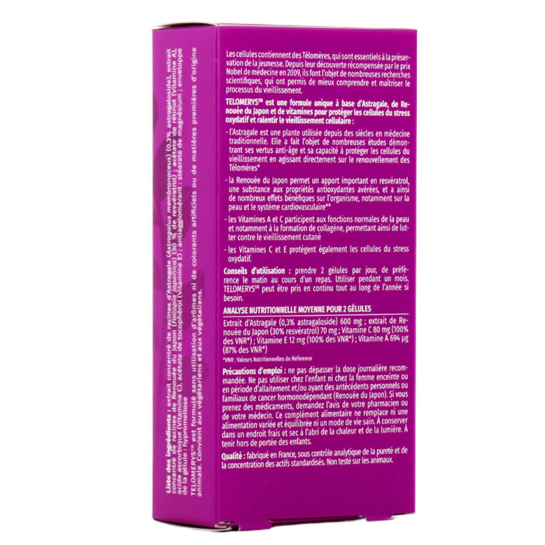 Depuis des siècles, l'astragale est une plante utilisée en médecine traditionnelle. Des études ont prouvé ses propriétés anti-âge et sa capacité à participer à la protection des cellules du vieillissement en agissant sur le renouvellement des télomères. La renouée du Japon est une plante qui contient une quantité importante de resvératrol, une substance connue pour ses propriétés antioxydantes bénéfiques pour l'organisme. Cette plante a des effets positifs sur la peau. Les fonctions normales de la peau, telles que la formation de collagène, sont soutenues par les vitamines A et C. Cela aide à prévenir le vieillissement cutané. Grâce à TELOMERYS ANTI AGE, votre peau retrouve son élasticité et sa fermeté pour un teint plus lumineux et une apparence plus jeune. Les effets bénéfiques de ce complément alimentaire sont visibles dès les premières semaines d'utilisation.